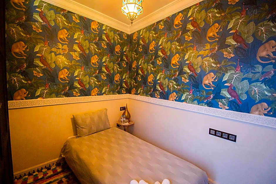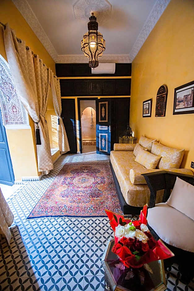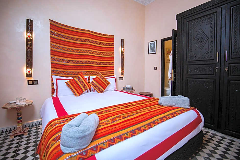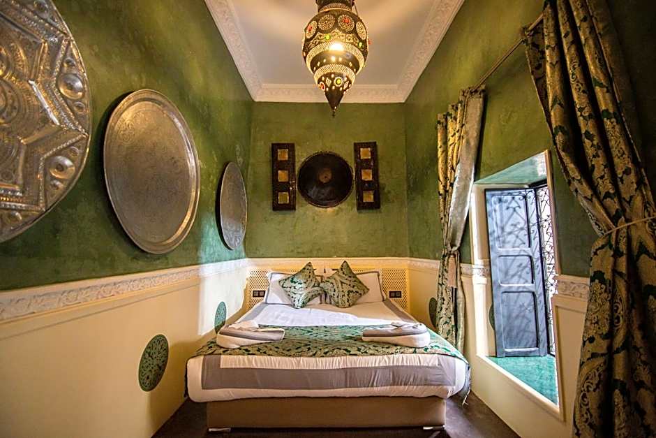 A very large room with polished, wrought-iron furniture, located on the first floor of the riad. The huge bathroom is made of tadelakt black and has a small window that opens out over the derb below.